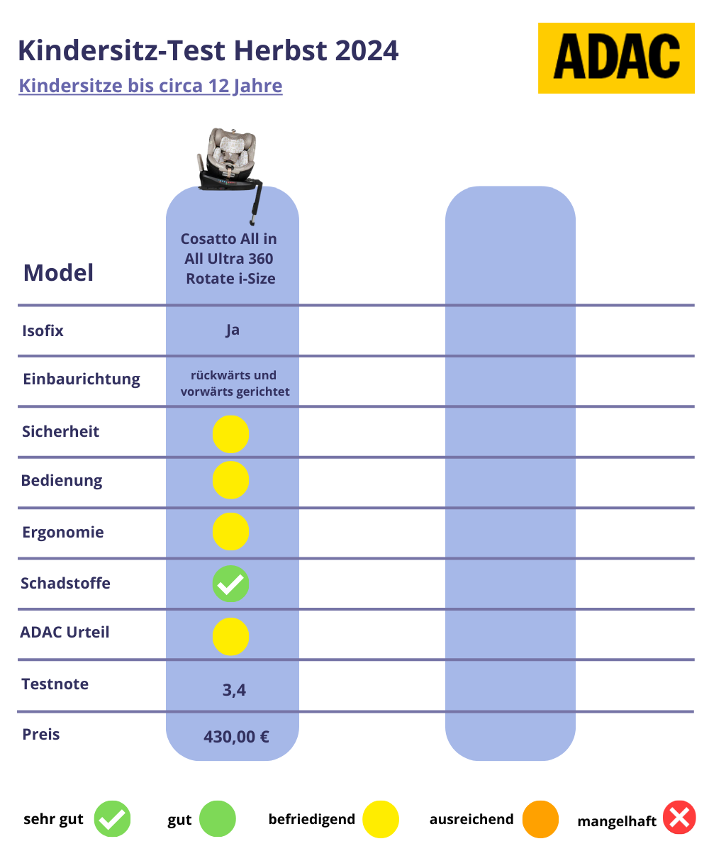 Auch in der Kategorie „Kindersitze bis ca. 12 Jahre“ wurde dieses Jahr nur ein Kindersitz getestet, der Cosatto All in All Ultra 360 Rotate i-Size.