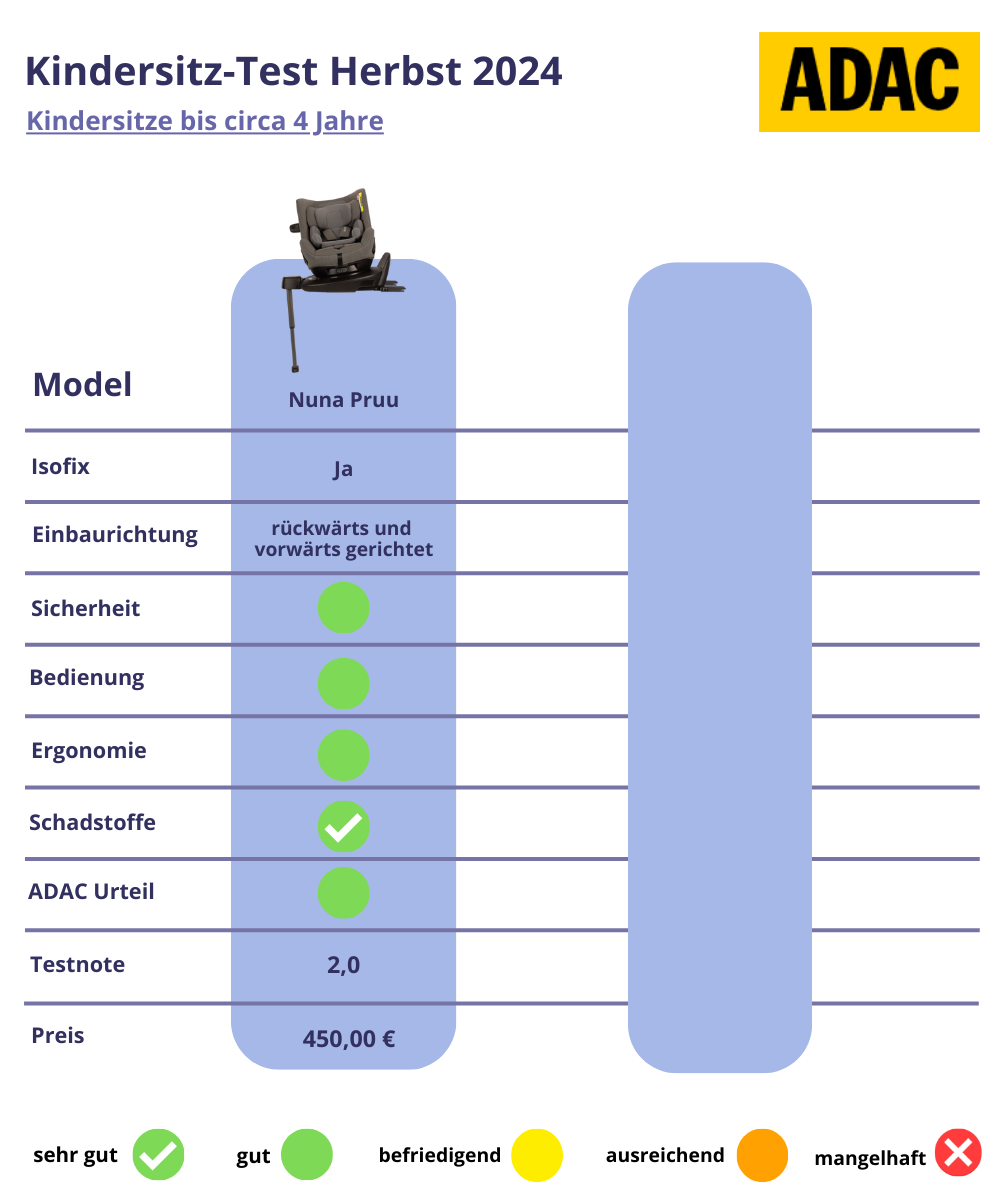 In der Kategorie „Kindersitze bis ca. 4 Jahre“ wurde dieses Jahr nur ein Kindersitz getestet. Der Nuna Pruu konnte hier mit einer Gesamtwertung von 2,0 die Note „gut“ erreichen. Er ist ab einer Körpergröße von 40 – 105 cm und bis zu einem Gewicht von bis zu 19 kg zugelassen.