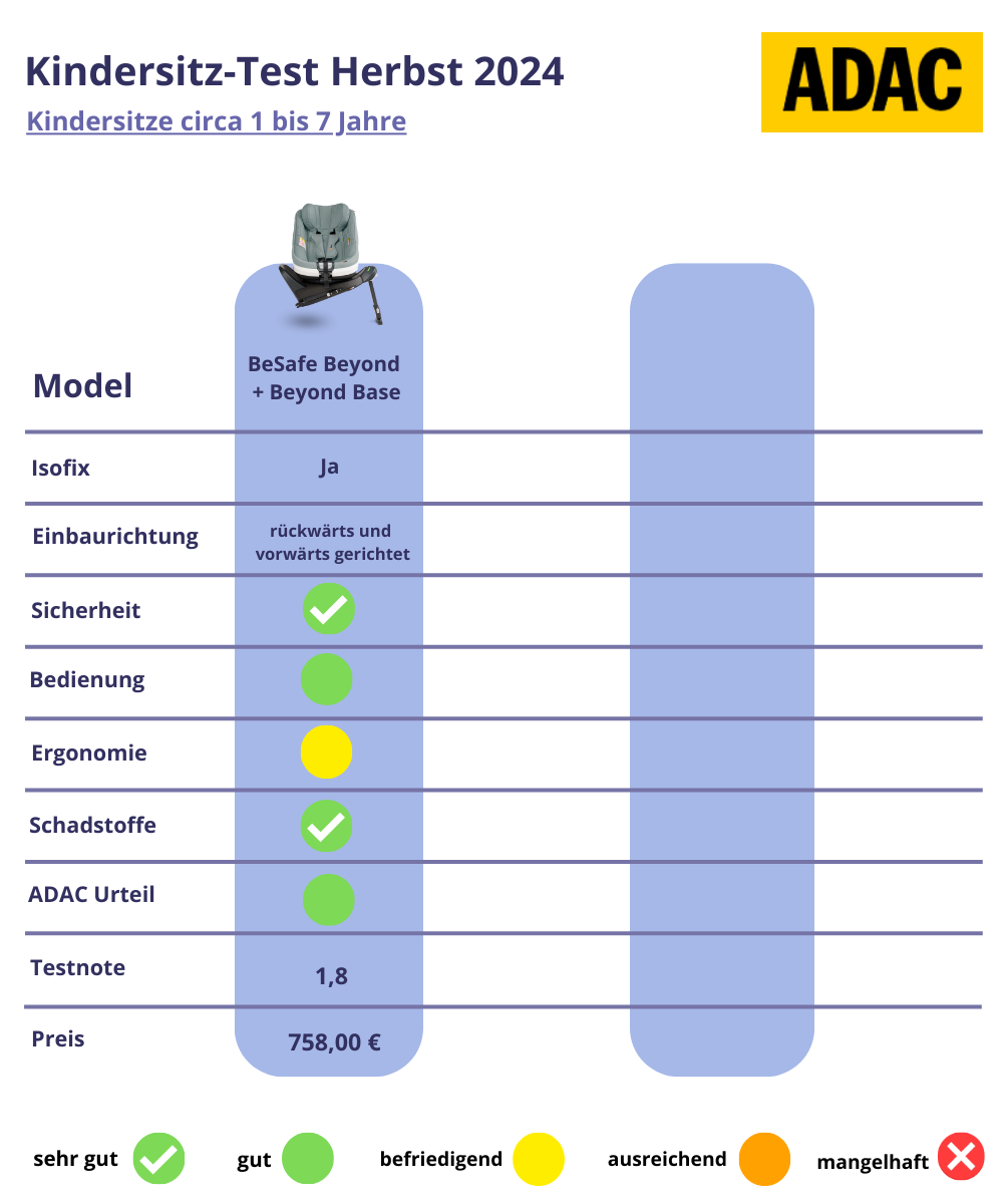 In der Kategorie „Kindersitze ca. 1 bis 7 Jahre“ wurde diesen Herbst ebenfalls nur ein Kindersitz getestet. Der in dieser Kategorie getestete BeSafe Beyond mit Beyond Base konnte eine Testwertung von 1,8 und damit die Note „gut“ erlangen. Dieser Sitz kann ausschließlich rückwärtsgerichtet genutzt werden und ist mit einer Körpergröße von 61 – 125 cm/ bis 22 kg zugelassen.
