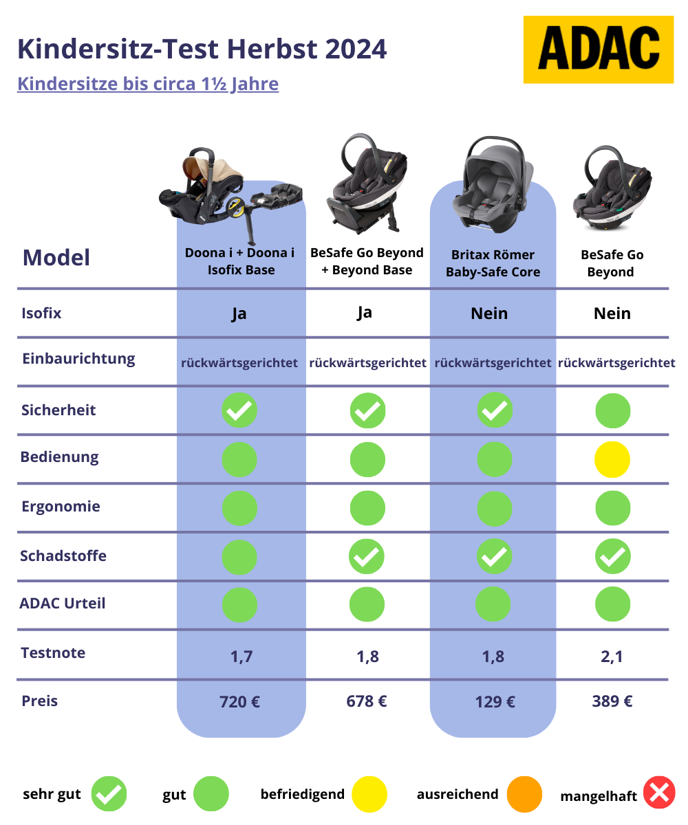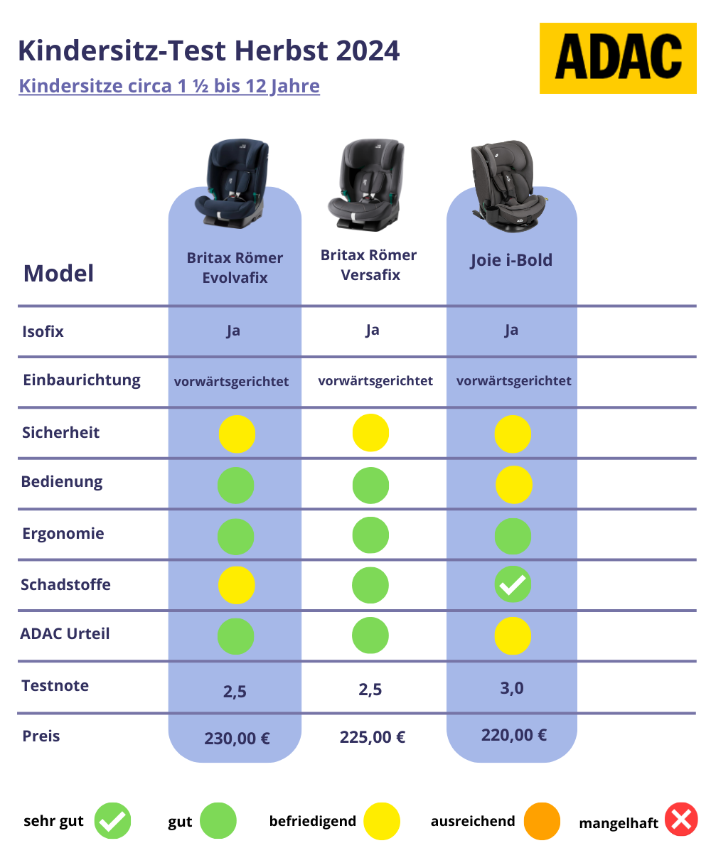Hinweis: Die Kindersitze werden, wie im ADAC-Test anhand ihrer Nutzungsdauer kategorisiert. In den nachfolgenden Abschnitten könnt ihr genaueres über die Testwerte der einzelnen Kategorien erfahren.