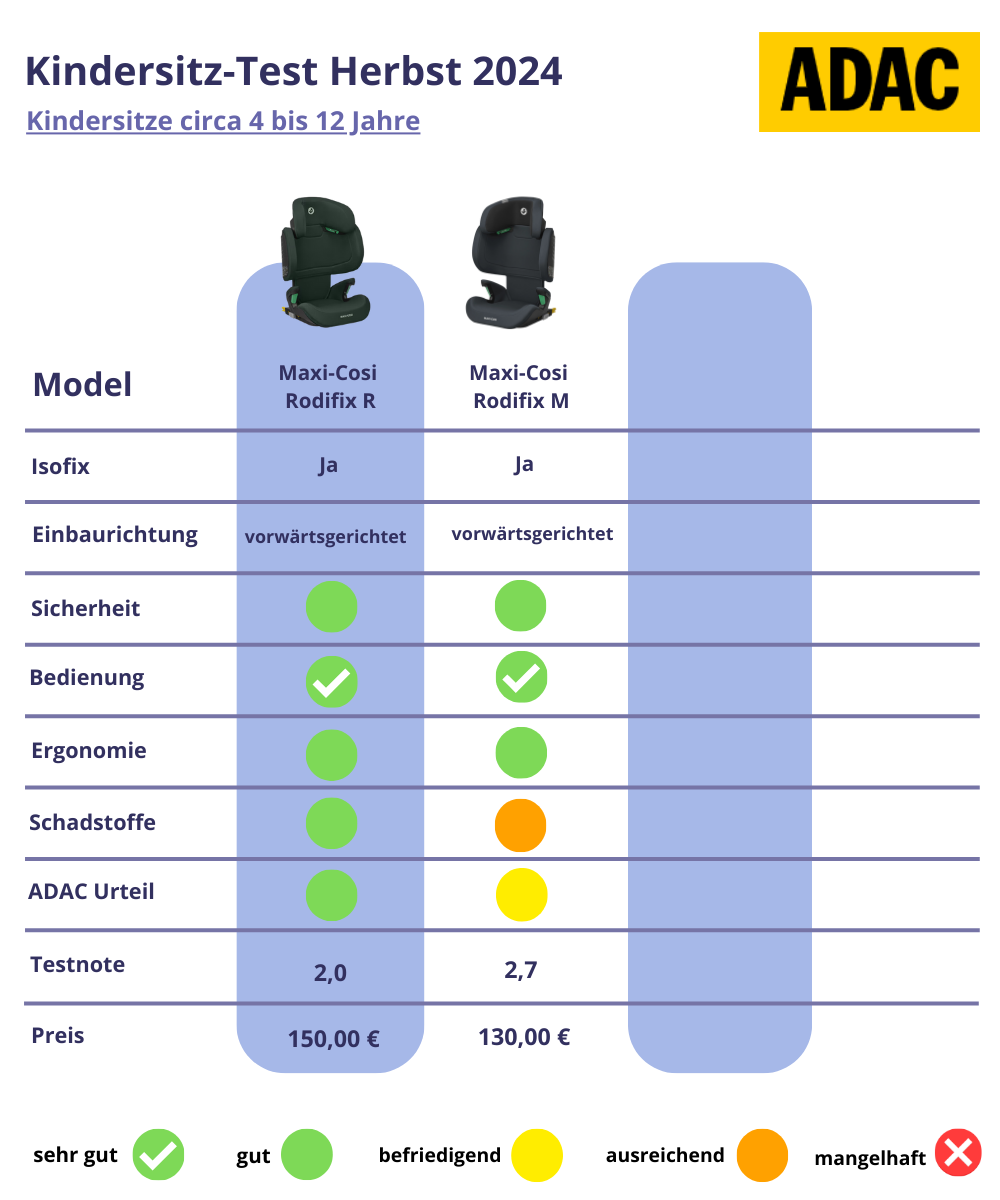 In der letzten Kategorie „Kindersitze ca. 4 bis 12 Jahre“ wurden dieses Jahr 2 Kindersitze getestet, die beide vom Hersteller Maxi-Cosi stammen. Gemeint sind hier der Maxi-Cosi Rodifix R, der eine gute Wertung von 2,0 erreicht hat und der Rodifix M, der eine Wertung von 2,7 und somit die Testnote „befriedigend“ erzielte. Beide Folgesitze sind mit einer Körpergröße von 100 – 150 cm zugelassen.