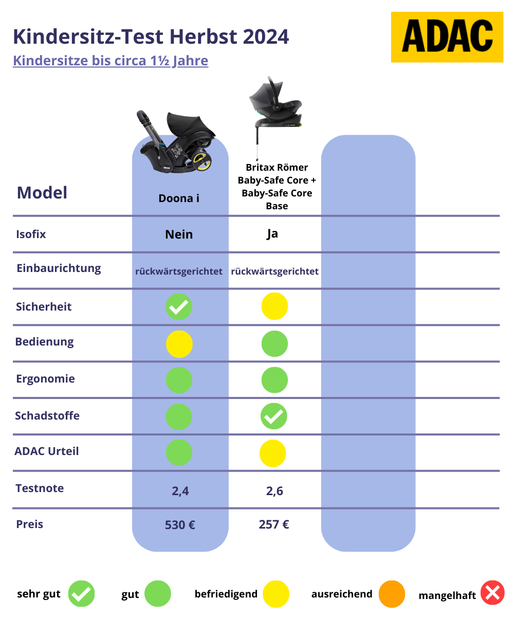 Die Go Beyond Babyschale ohne Base erreichte eine Gesamtwertung von 2,1, während die Doona i ohne Base eine Wertung von 2,4 erzielen konnte.